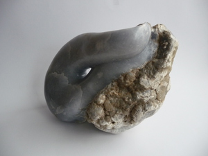 2018Combinatie Kalksteen (Pierre de lens) en hardhout (Paddoek) op een hardhouten sokkel. Convenit is Latijn en betekent; het past, het is samengekomen.